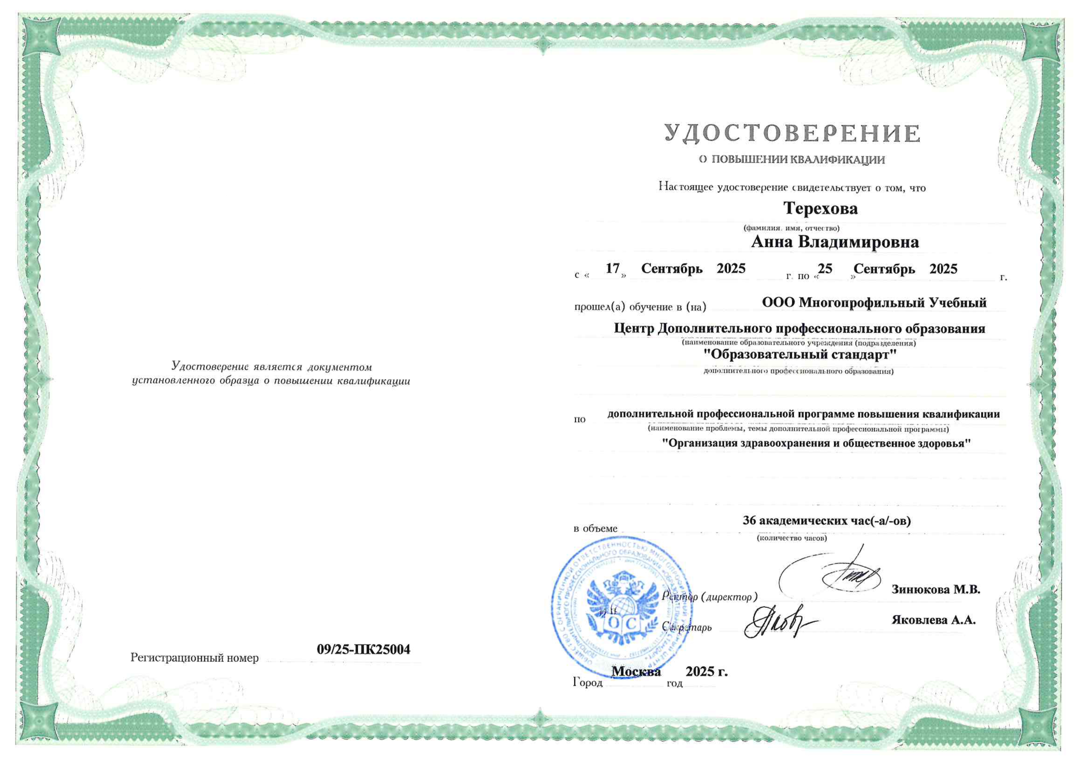 Дипломы и аттестаты Терехова Анна Владимировна